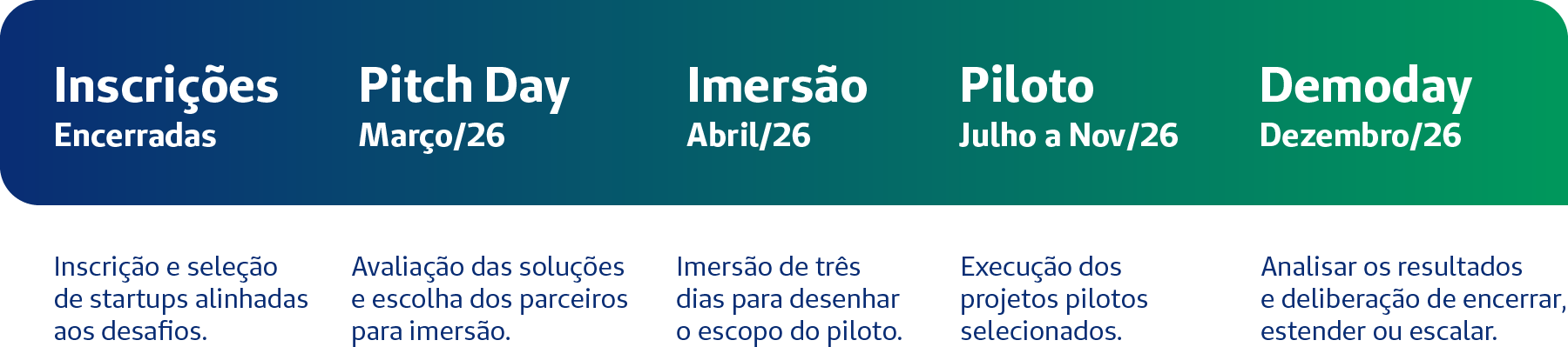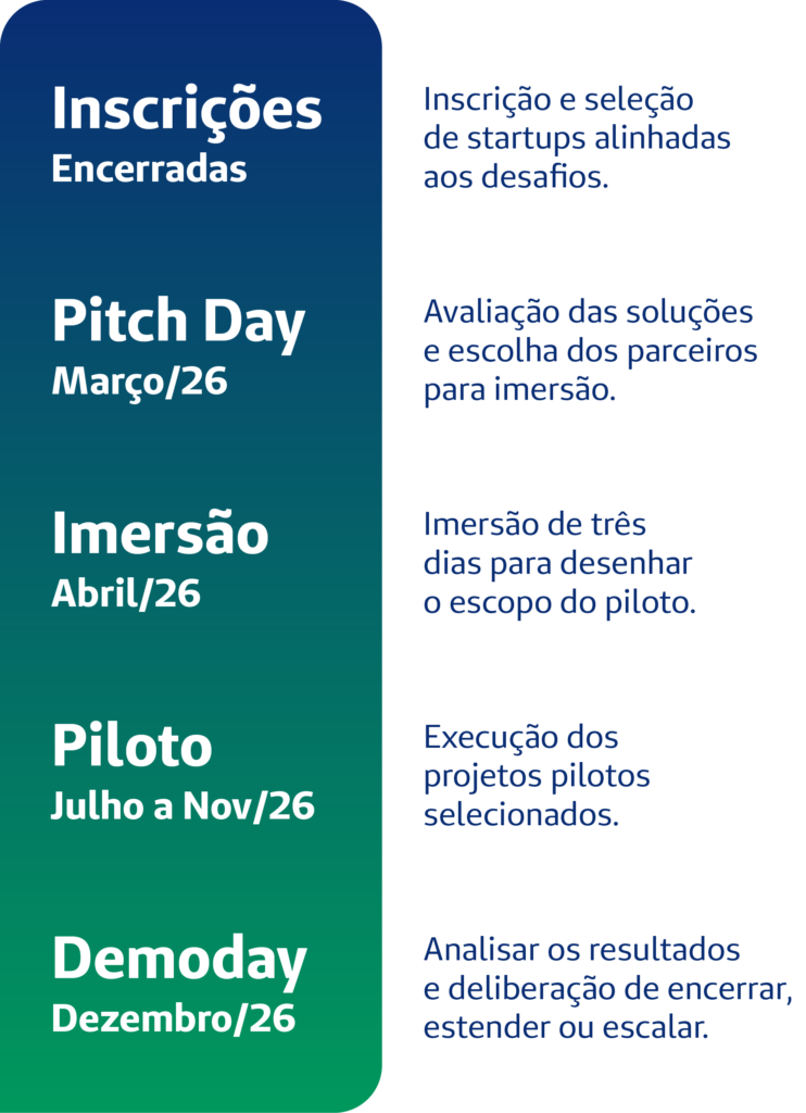 O programa objetiva a conexão com startups e pode gerar contratos de fornecimento ou modelos de parceria. Nos casos de fornecimento de produto pronto, a propriedade intelectual da solução apresentada continua sendo da startup. Nos eventuais casos de codesenvolvimento, a propriedade intelectual será discutida entre as partes.